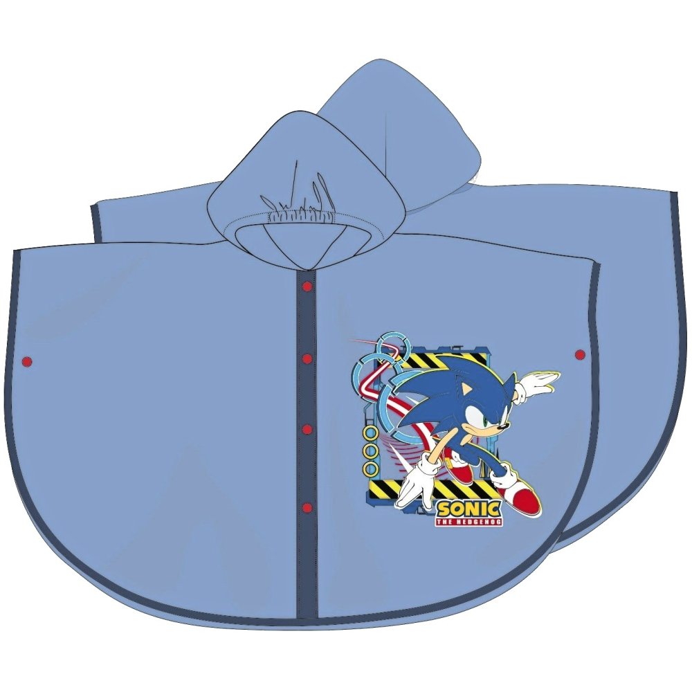 Detské pončo do dažďa Ježko Sonic s kapucňou a obrázkom obľúbeného ježka Sonika z filmov, seriálov a hier. Pláštenka je vyrobená z pevného, ale mäkkého PVC, ktoré odolá dažďu. Vďaka zapínaniu na cvoky sa ľahko oblieka a voľný strih zaisťuje pohodlný pohyb. Veľkosti 104, 116, 128 a 140.