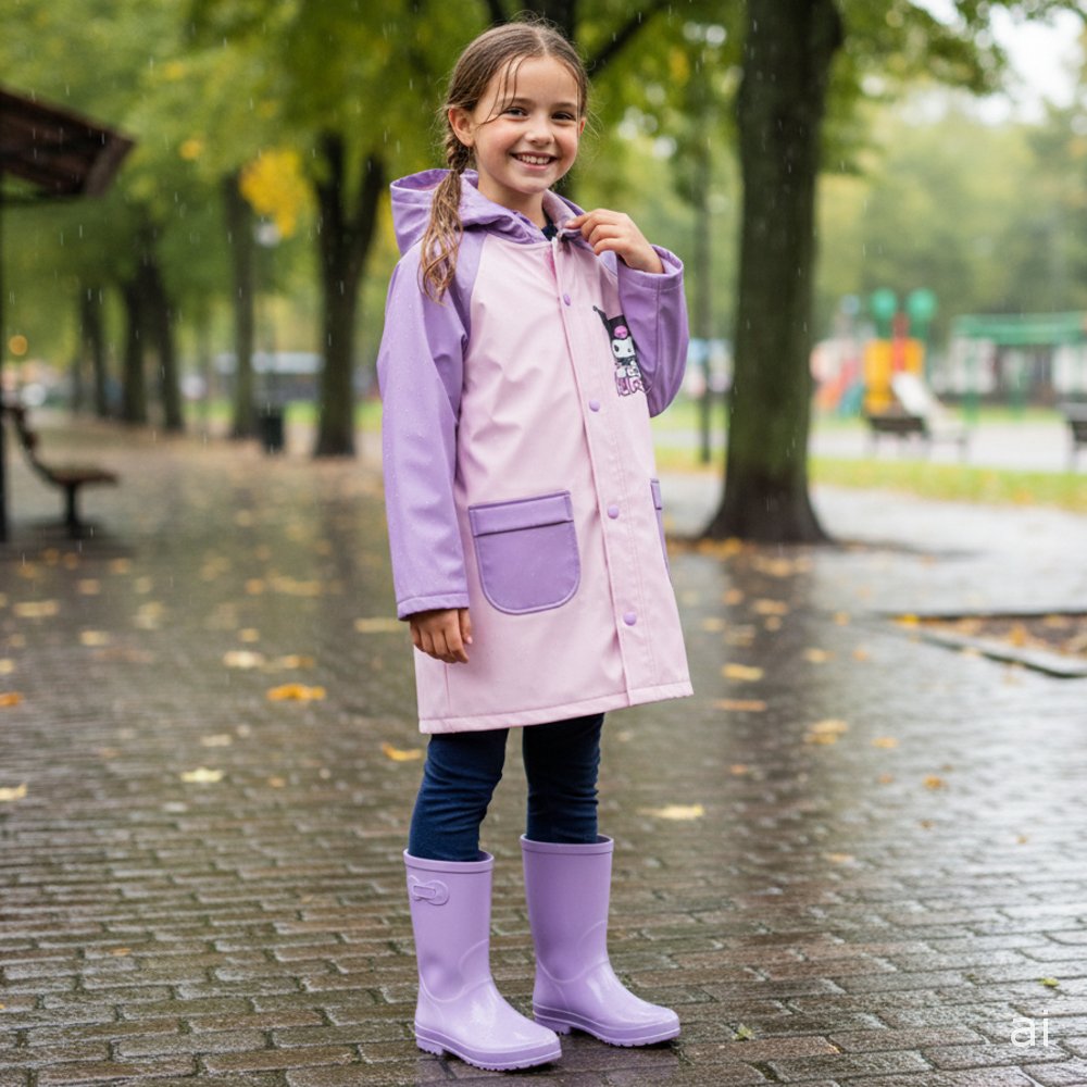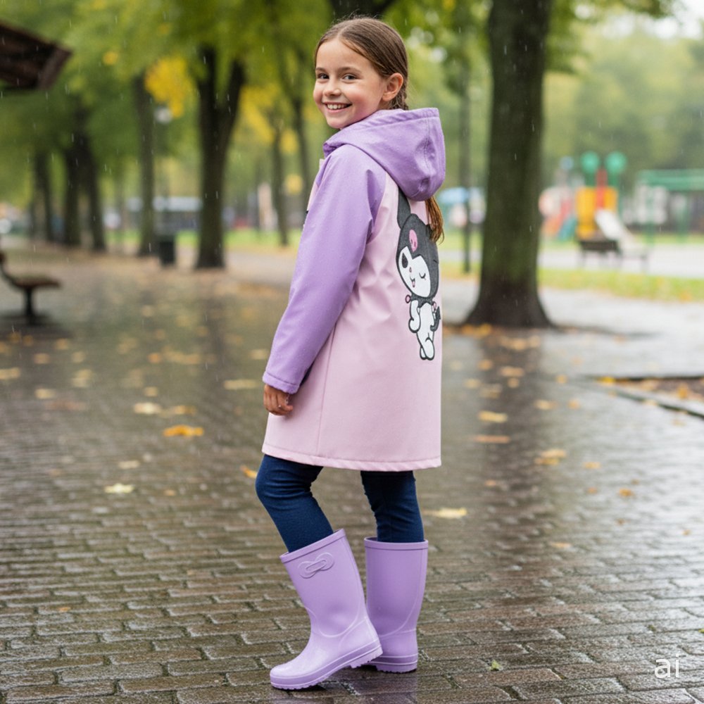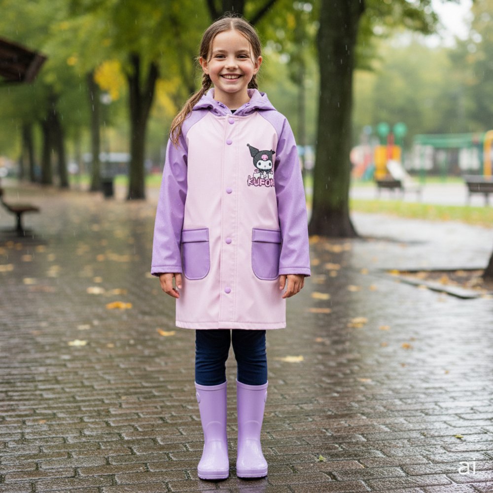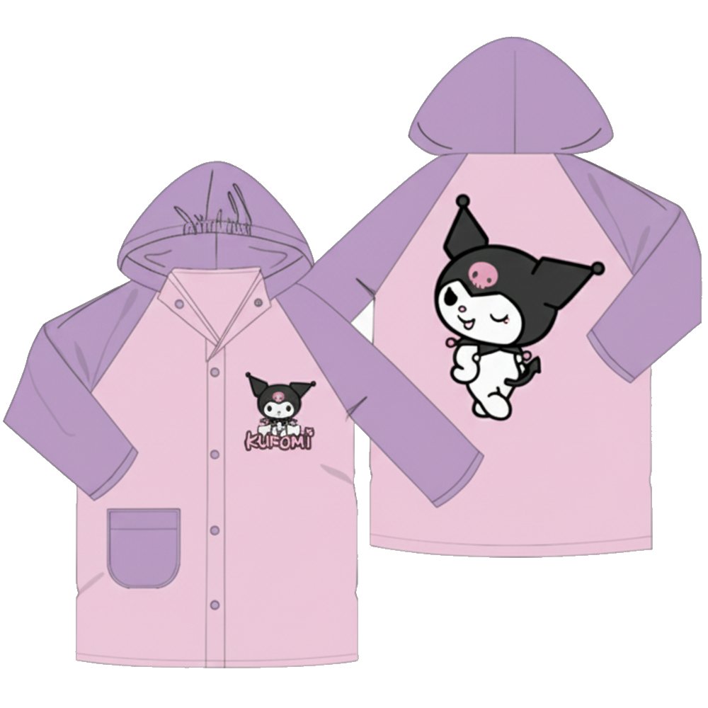 Detský pršiplášť Kuromi pre dievčatá s kapucňou, zapínaním na cvoky a jedným vreckom. Ponúkame ho vo veľkostiach 104, 116, 128 alebo 140, teda pre deti približne od 4 do 10 rokov. Ideálny do škôlky, na ihrisko aj na cesty v daždivom počasí.