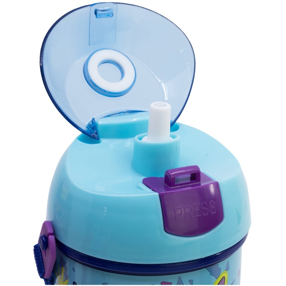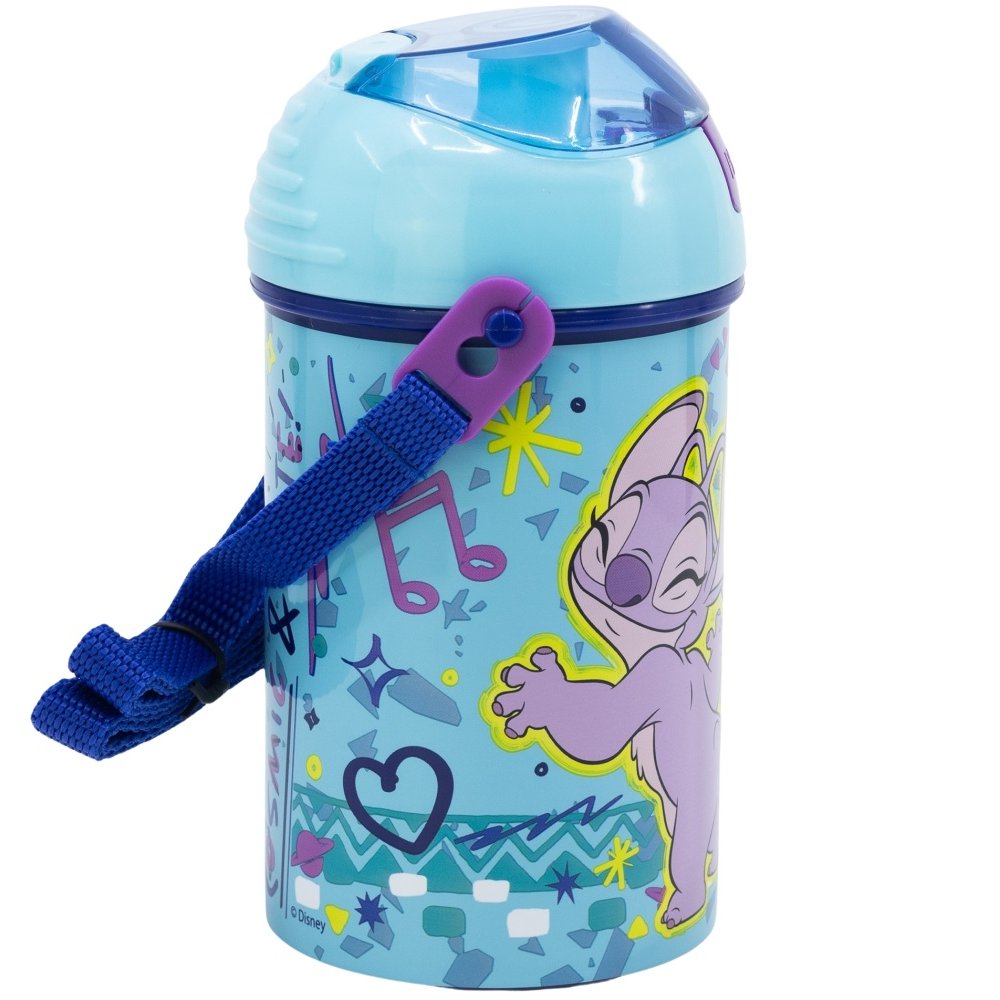 Praktická fľaša s veselým motívom obľúbených mimozemšťanov Stitcha a Angel. Je vyrobená z odolného plastu bez obsahu BPA. Má automatický otvárací systém s viečkom a silikónovou slamkou aj textilný popruh cez rameno. S objemom 450 ml je ideálnym spoločníkom do škôlky, školy aj na výlety.