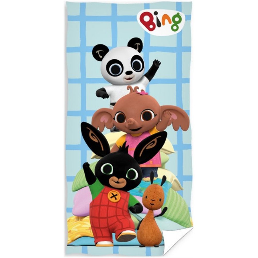 Detská plážová osuška Zajačik Bing Bunny a kamaráti. Istotne poteší všetky deti. Je vyrobená zo 100% bavlneného dobre savého froté s gramážou 300 g/m². Zdobí ju obrázok Zajačika Binga a jeho kamarátov Pando, Suly a Flopa. Je ideálna nielen na doma, ale hodí sa aj na pláž, alebo k bazénu. Farby osušky sú veľmi intenzívne aj po mnohých praniach. Rozmery tejto osušky Zajačik Bing Bunny sú 70 x 140 cm.