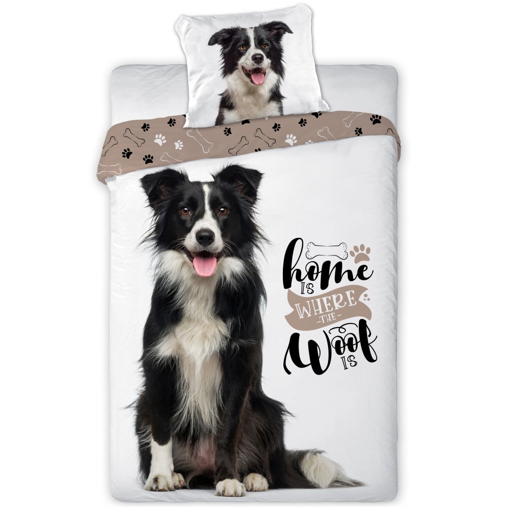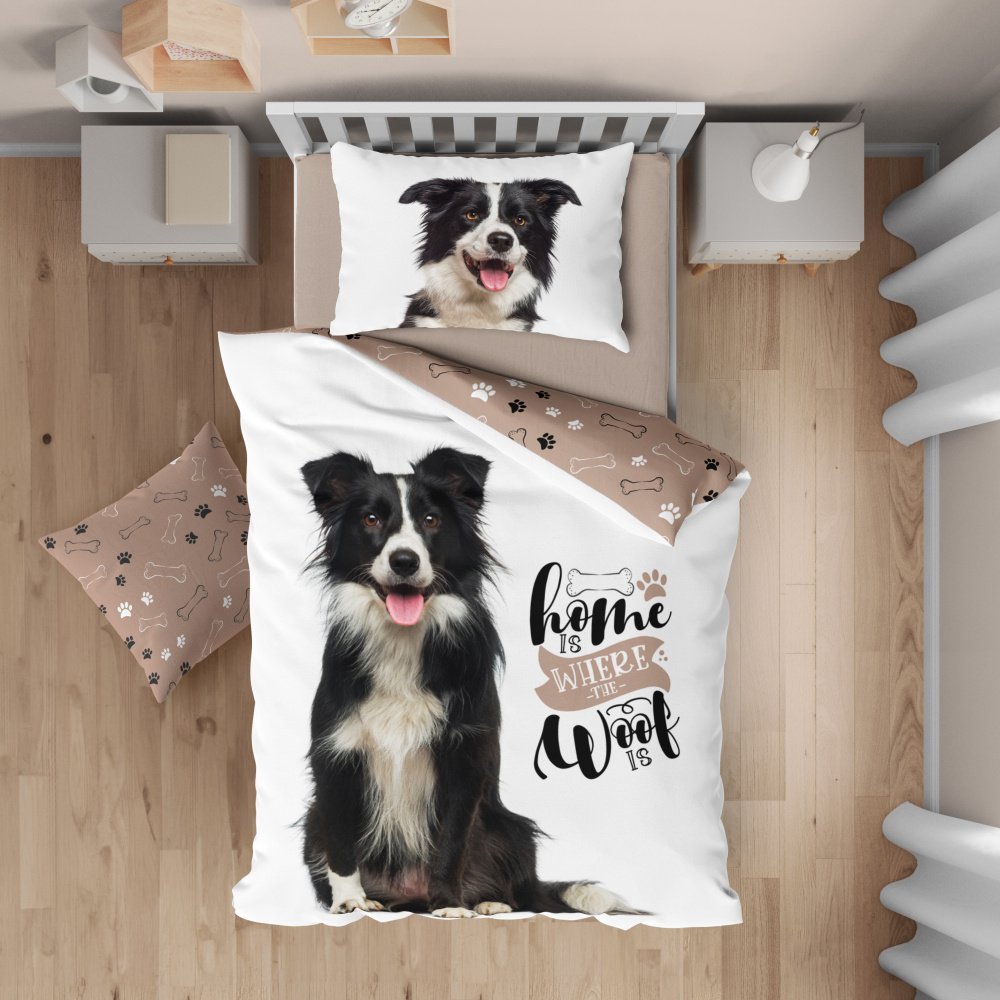 Obojstranné obliečky pre milovníkov zvierat, najmä psov. Na prednej strane prikrývky je obrázok Border kólie, zadná strana je béžová s odtlačkami psích labiek a symbolmi psích maškŕt. Aj vankúš zdobí obrázok Border kólie. Vyrobené zo 100 % bavlny so zapínaním na zips. Rozmery sú 140 x 200 cm + 70 x 90 cm.