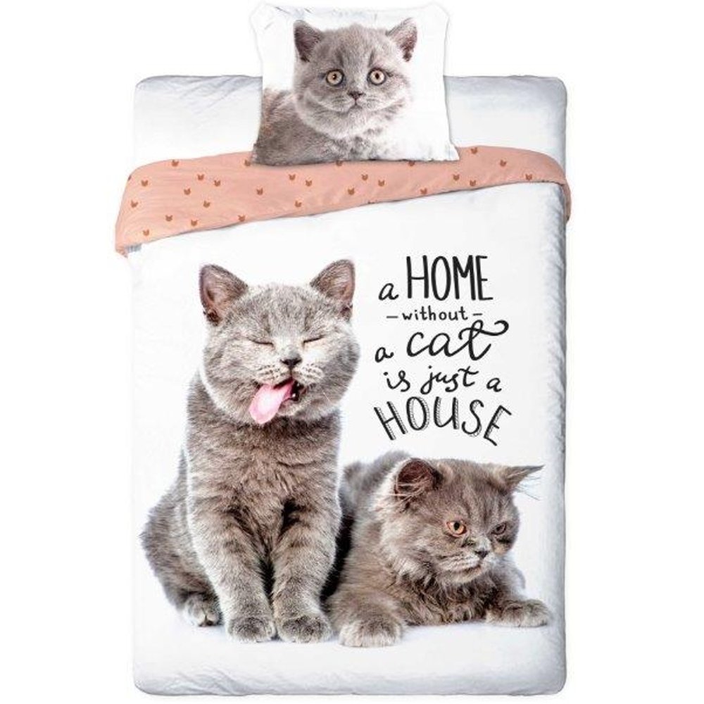 Obojstranné obliečky pre milovníkov zvierat, najmä mačiek. Na prednej strane prikrývky je obrázok Britských krátkosrstých mačiek, druhá strana je béžová so siluetami mačacích hláv. Aj vankúš zdobí obrázok mačky. Vyrobené zo 100% bavlny so zapínaním na zips. Rozmery sú 140 x 200 cm + 70 x 90 cm.
