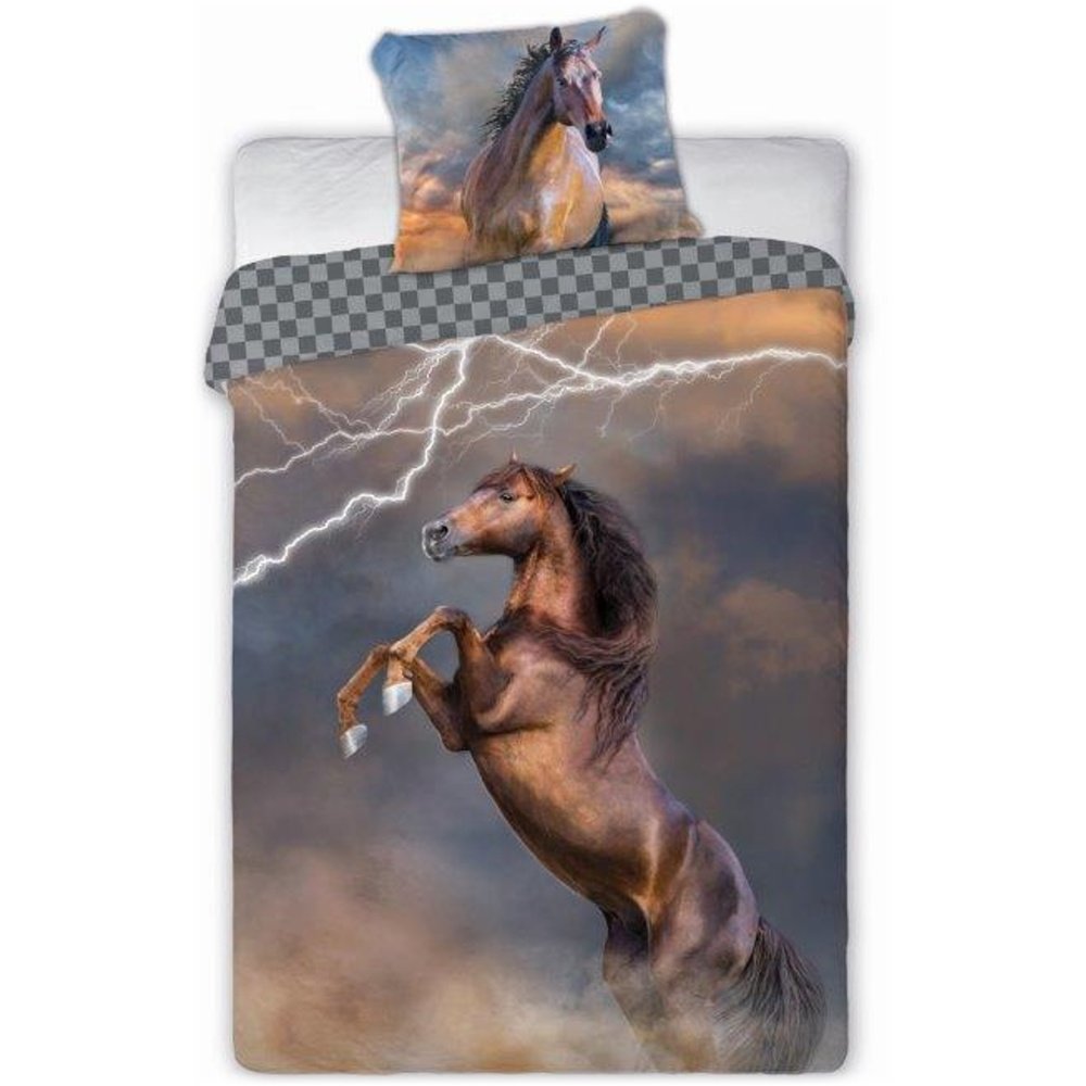 Obojstranné obliečky pre milovníkov zvierat, najmä koní. Lícnu stranu prikrývky zdobí obrázok arabského plnokrvníka s dramatickým pozadím, druhá strana je šedá so šachovnicovým vzorom. Vankúš taktiež zdobí obrázok koňa. Vyrobené zo 100% bavlny so zipsom. Rozmery: 140 x 200 cm + 70 x 90 cm.
