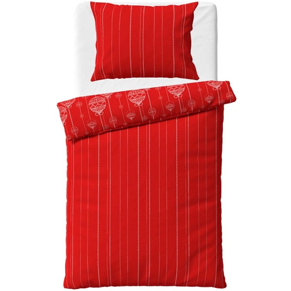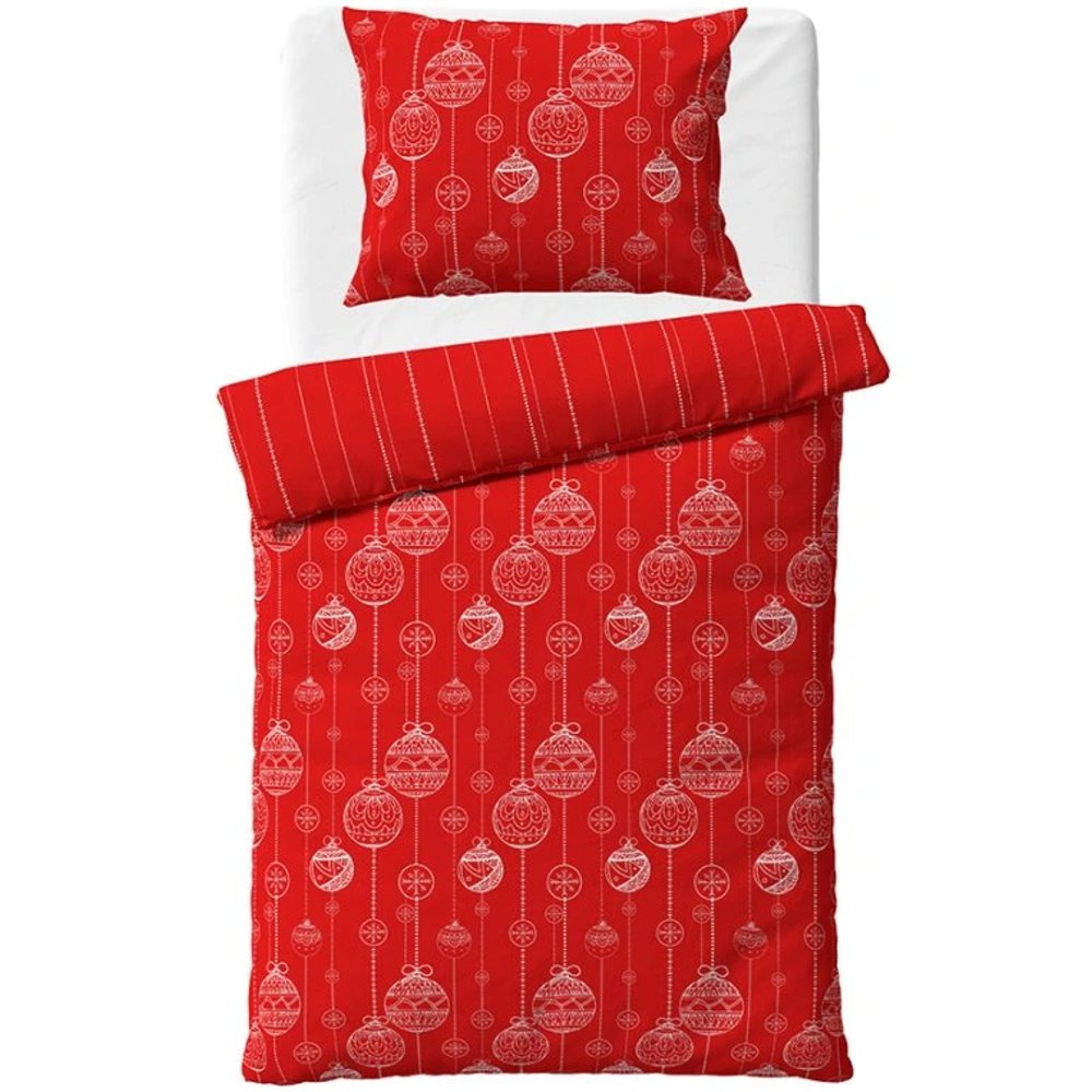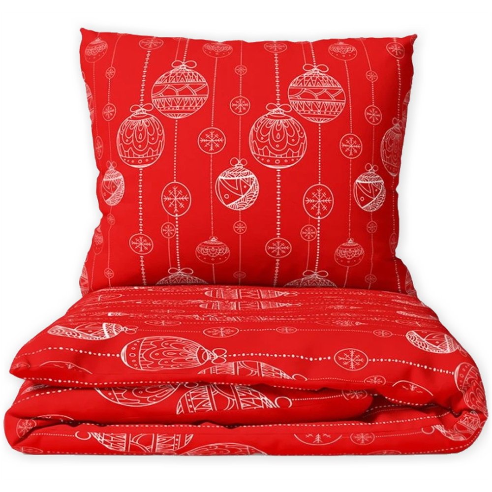 Vianočné posteľné obliečky s motívom bielych baniek na perličkovej retiazke s červeným podkladom prinesú do vašej spálne kúzlo vianočnej atmosféry. Sú vyrobené zo 100% bavlny renforcé v rozmere 140 x 200 cm + 70 x 90 cm, so zipsovým zapínaním.