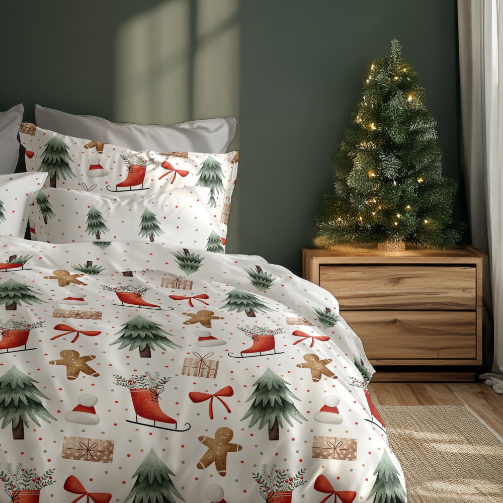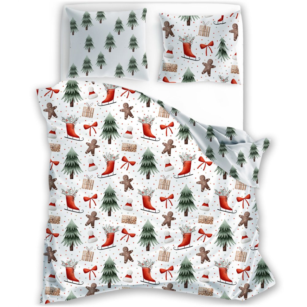Obojstranná vianočná súprava posteľných obliečok s motívom medovníčkov a ďalších vianočných motívov na bielom podklade, na druhej strane je celý les vianočných jedličiek. Obliečky sú vyrobené zo 100 % bavlny, obsahujú 1× obliečku na prikrývku 140×200 cm a 1× obliečku na vankúš 70×90 cm (±3 %), zapínanie je na zips.