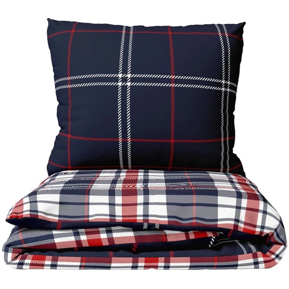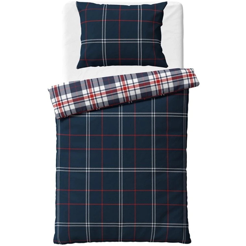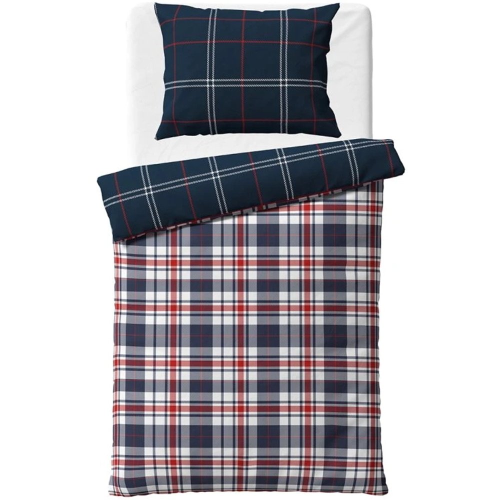Flanelová súprava posteľných obliečok Káro Oxford zo série BedTex Home Line s klasickým károvaným motívom v tmavomodrej, červenej a bielej kombinácii. Vyrobená z hebkého flanelu s vyššou gramážou a jemne česaným povrchom. Rozmery 140 x 200 cm a 70 x 90 cm, zapínanie na zips.