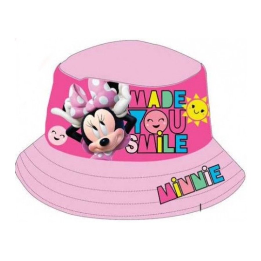 Detský klobúčik Minnie Mouse - Disney. Zdobí ho obrázok legendárnej myšky Minnie a dúhový nápis Made you smile. Strecha a krempa klobúku je svetlo, alebo tmavo ružová - viď. výber farby a veľkosti nižšie.