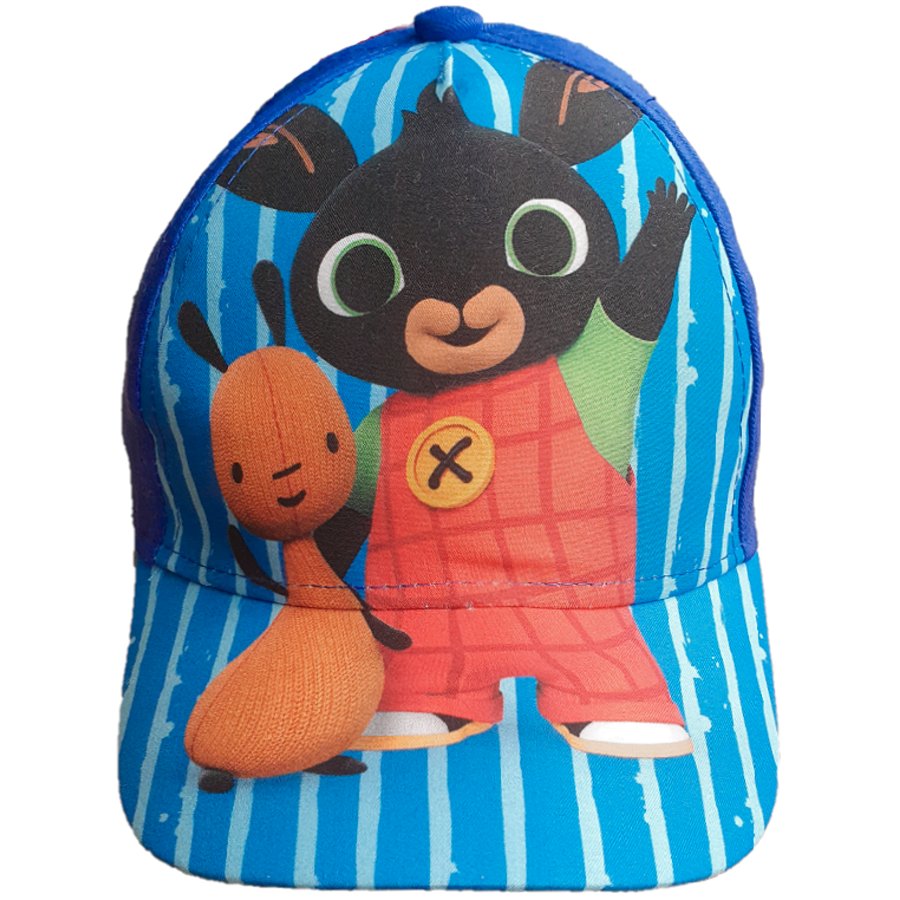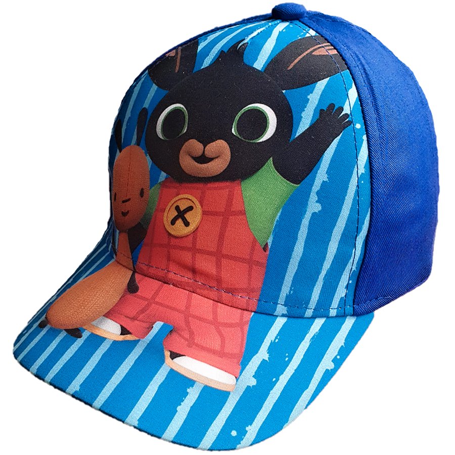 Chlapčenská šiltovka s motívom Zajačik Bing. Prednú stranu čiapky a šilt zdobí obrázok zajačika Binga a jeho opatrovateľa Flopa na modro - bielom pruhovanom podklade. Potlačená časť je vyrobená z polyesteru. Zostávajúca časť šiltovky je vyrobená z bavlny a je modrá, alebo červená - viď výber veľkosti a farby. Zo zadnej strany je nastavovací pásik so suchým zipsom.