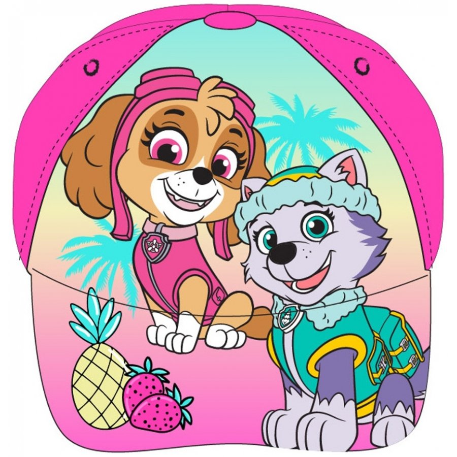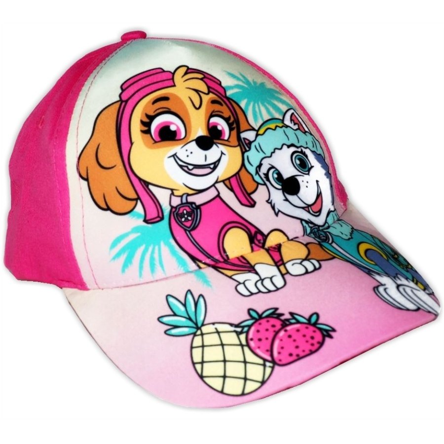 Detská baseballová čiapka so šiltom Paw Patrol - Tlapková patrola - motív Skye a Everest. Prednú stranu čiapky a hornú časť šiltu zdobí obrázok psích záchranárok Skye a Everest na pláži, s palmami v pozadí a s tropickým ovocím. Zostávajúca časť čiapka je ružová, alebo tyrkysová - viď výber veľkosti a farby nižšie. Zo zadnej strany je nastavovací pásik so suchým zipsom.