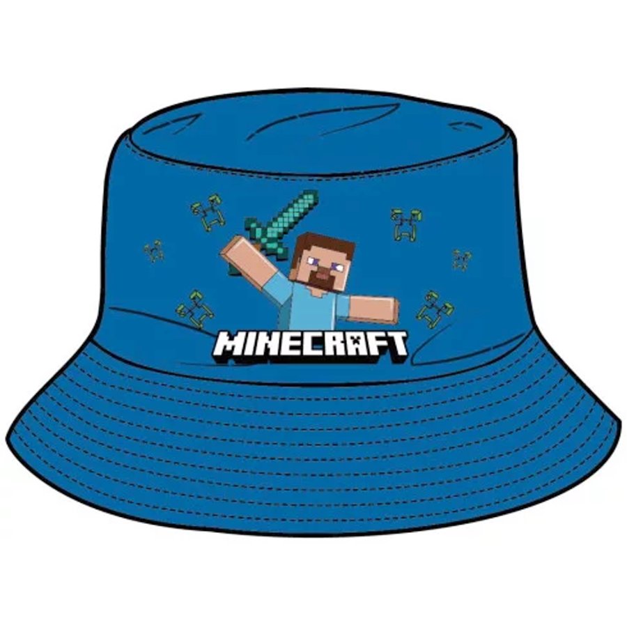 Detský klobúčik Minecraft - motív Steve. Klobúk je modrý s motívom základného skinu v hre Minecraft postavičky Steva.