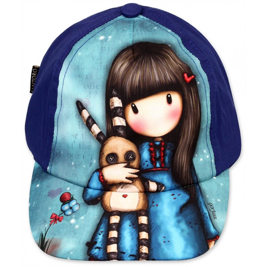 Dievčenská baseballová čiapka Santoro London ®. Prednú stranu čiapky zdobí obrázok bábiky Gorjuss. Zadná časť tejto čiapky Santoro London a spodná časť dobre vystuženého šiltu je tmavo modrá. Zo zadnej strany je tiež nastavovací pásik so suchým zipsom.