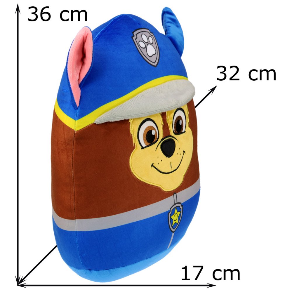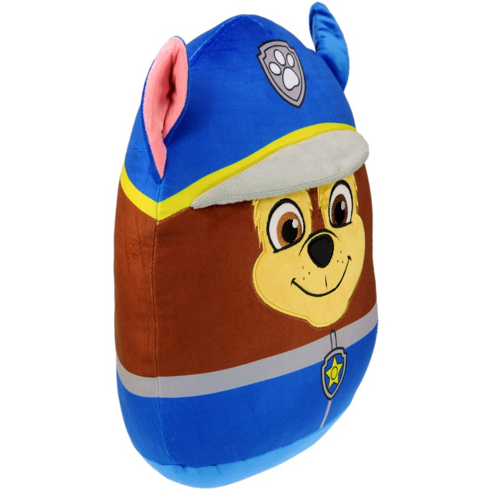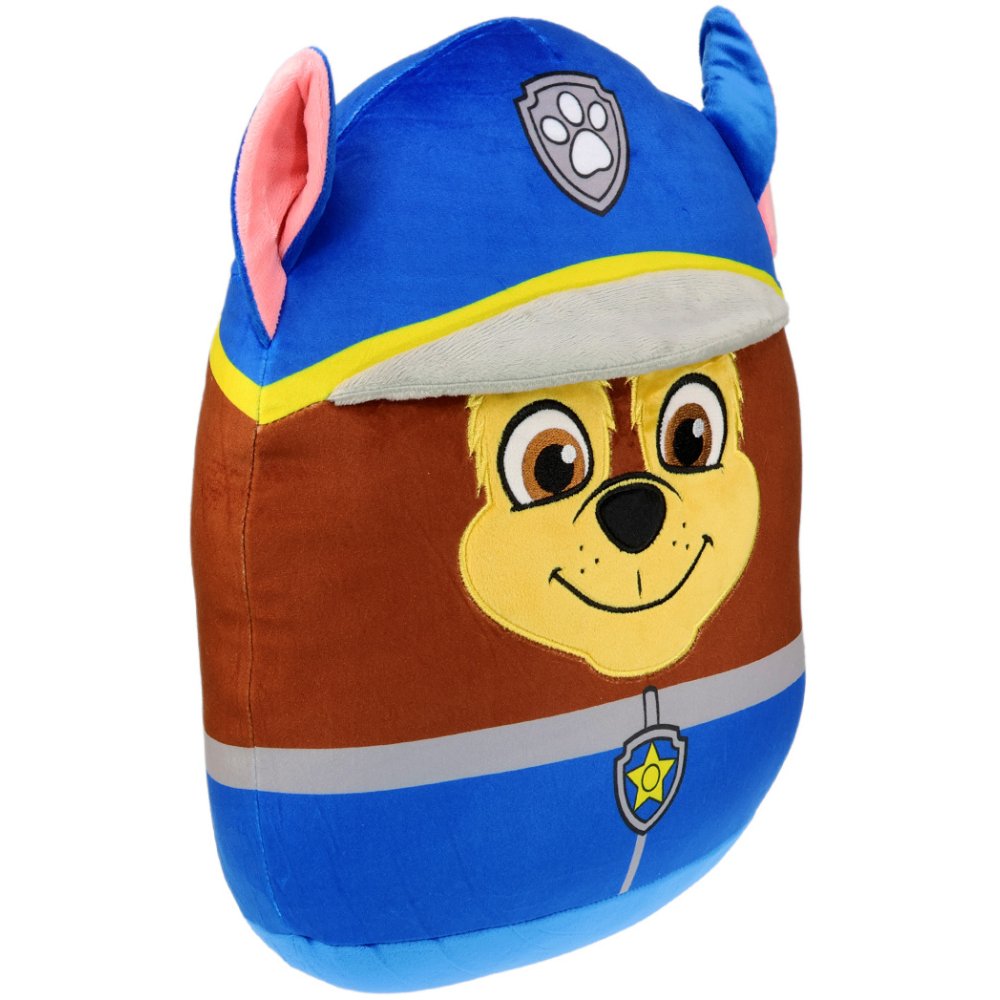 Tvarovaný 3D squish vankúšik Paw Patrol - motív policajt Chase. Super mäkký, elastický a stláčací plyšový vankúšik na mojkanie, hranie alebo ako roztomilá dekorácia do detskej izbičky. Rozmery sú cca 36×32×17 cm.